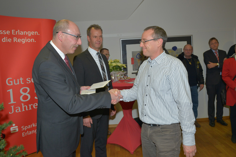 Die Sparkasse Erlangen setzte auch in ihrem 185-jährigen Jubiläumsjahr ihre vorweihnachtliche Tradition fort: die jährliche Weihnachtsspenden-Übergabe. Sie unterstützt gemeinnützige Projekte von Einrichtungen mit karitativem und sozialem Charakter, aber auch Verbände und Institutionen aus den Bereichen Sport, Kultur, Umwelt und Bildung. Bei der Weihnachtsspendenübergabe am 09.12.2014 in der Sparkasse Herzogenaurach konnten Harald Hofmann und Andreas Nürnberger von den Vorständen der Sparkasse Erlangen, Walter Paulus-Rohmer und Heinz Gebhardt, eine Spende entgegennehmen. Mit der Spendenaktion setzt die Sparkasse Erlangen ein deutliches Zeichen: Engagement und ehrenamtliche Arbeit werden aktiv unterstützt.